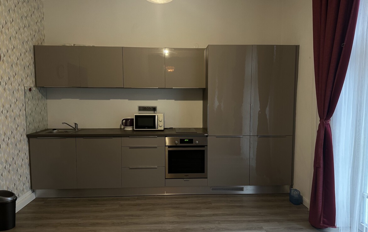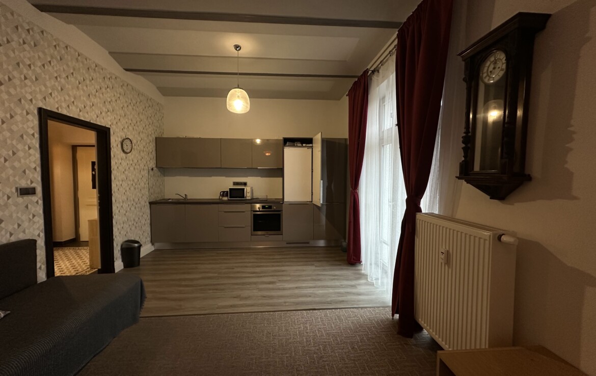 Byt 1+ kk o výměře 41,2m² je funkčně rozdělen na dvě části a navozuje tak dojem 2+kk. V přední části je kuchyňská linka propojená s jídelnou a obývacím prostorem s gaučem. Zadní část poskytuje prostor pro zařízení ložnice.