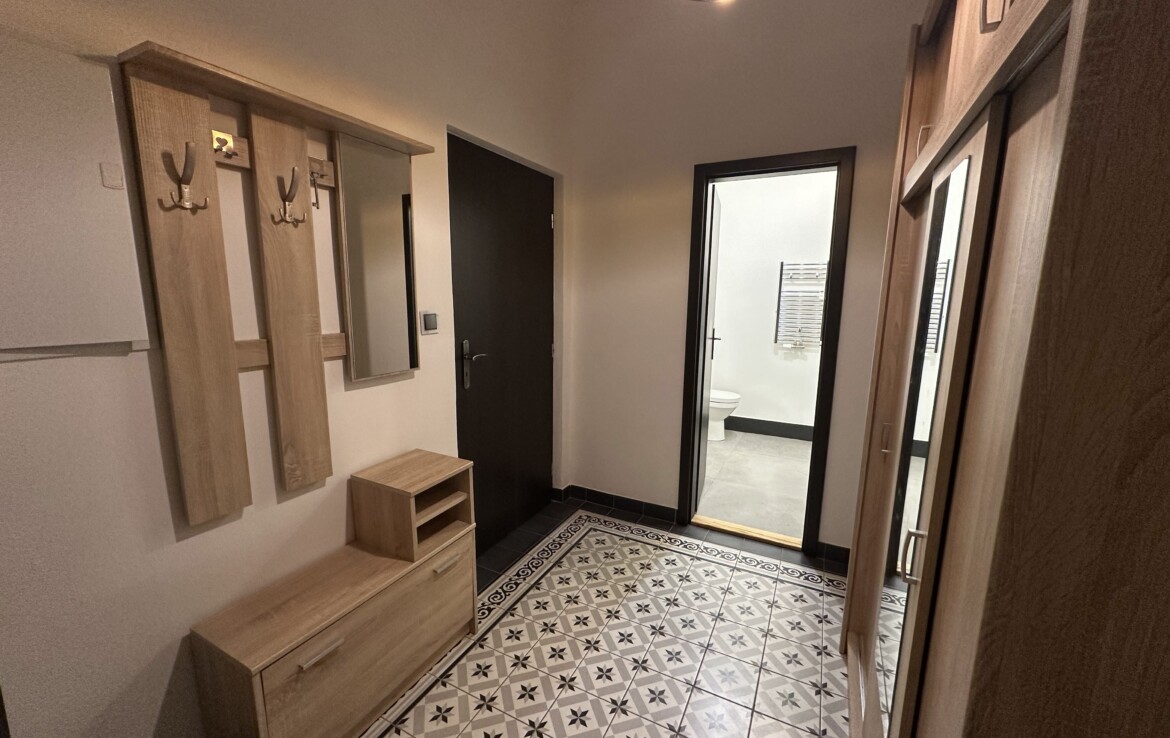 Součástí bytu je plně vybavená kuchyňská linka, prostorná šatní skříň, regál s knihovnou, gauč, TV stolek s TV. Další dovybavení je možné po domluvě.